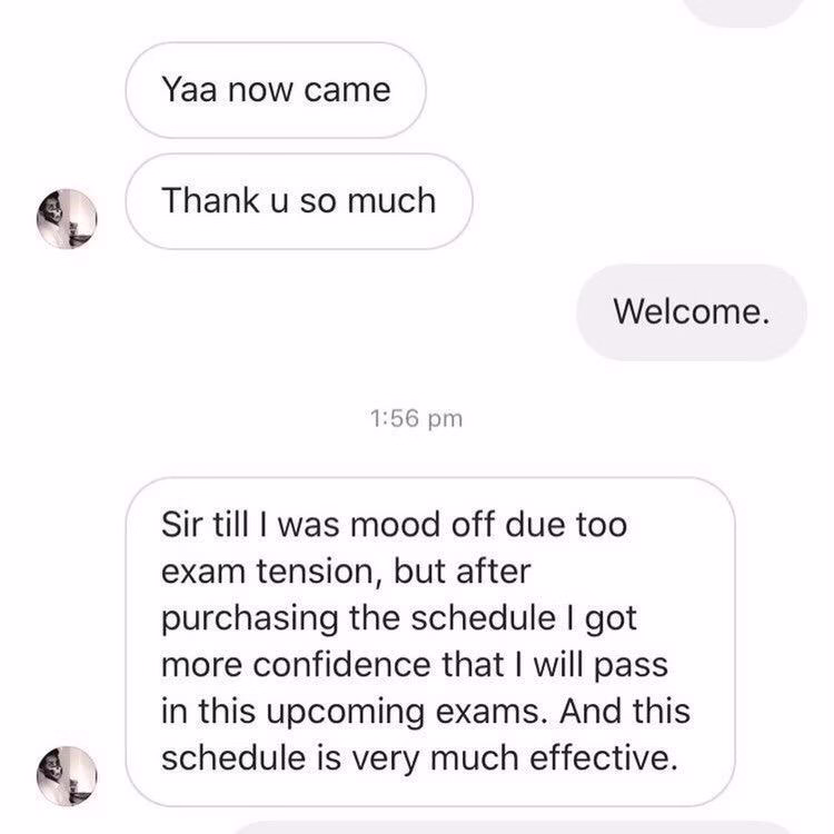 Hello sir .. I am really thank full To you for such type of schedule you have give and without any stress i complete my subject and i prepare for such .....examination ...